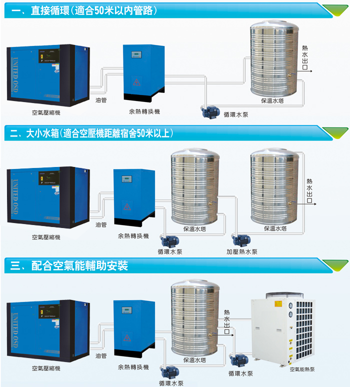 空壓機余熱回收器是對空壓機潤滑油中的熱星進行科學(xué)回收的一種節(jié)能設(shè)備一臺50匹的空壓機時安裝了空壓機熱水器后